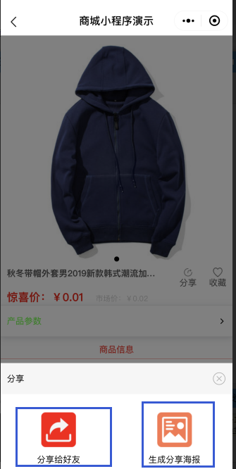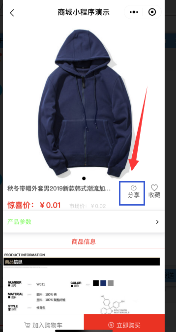 1. 在小程序编辑器-产品详情中,点击“属性设置”选择“分享”,则可将该商品制作为海报进行分享,客户扫码后即可进入到该商品的产品详情页中,如图所示: