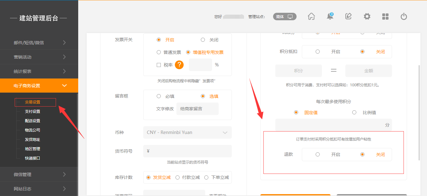 在后台,“电子商务设置”-“交易设置”中,有一个退款的操作,当开启该操作时,在前台用户页面可以直接申请退款,后台消息提醒中也会有相应的提示,点击“查看”即可(注:“退款”默认为关闭状态),如图所示: