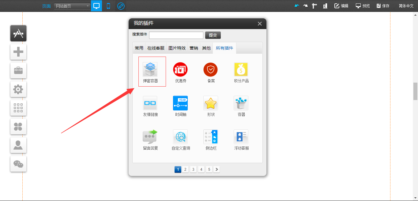 1.在PC编辑器中,点开“插件”,拖入“弹窗容器”插件,点击“生成弹窗”,在“弹窗容器”中点击“样式设置”可以对该容器的大小、关闭按钮样式以及遮罩样式进行设置,点击“选择插件”对可以拖入“文本”、“图片”、“视频”、“线条”、“站内搜索”以及“按钮”插件,“动画设置”是可以对该模块的展现形式进行设置,编辑完成后点击白色容器的“X”只是暂时在编辑器中隐藏了该编辑模块,如果需要彻底删除,需要在“生成弹窗”处关闭,并且支持将“生成弹窗”任意拖动到编辑器中的任意地方放置,如图所示: